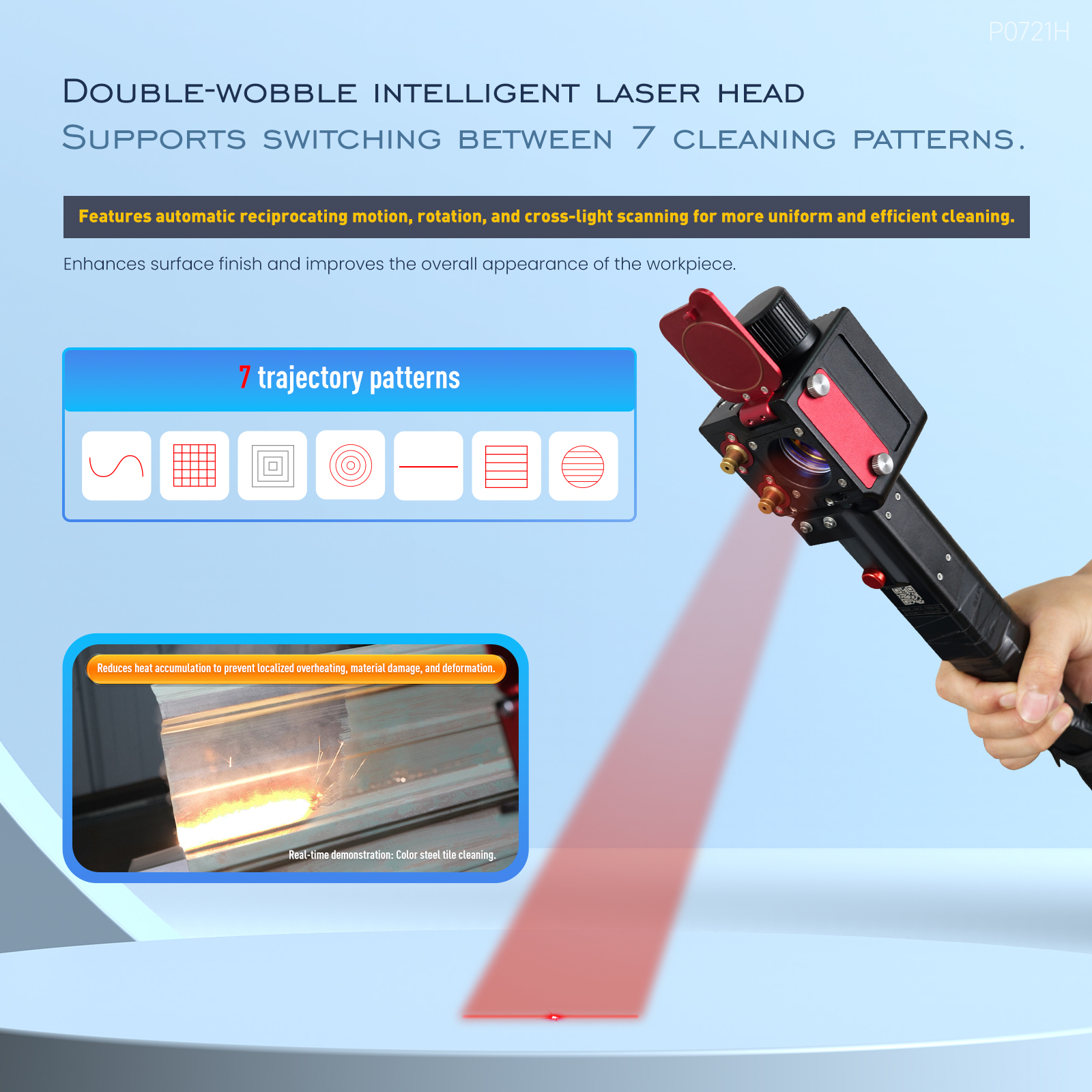 Double-wobble intelligent laser head supports switching between 7 cleaning patterns. Features automatic reciprocating motion, rotation, and cross-light scanning for more uniform and efficienct cleaning.