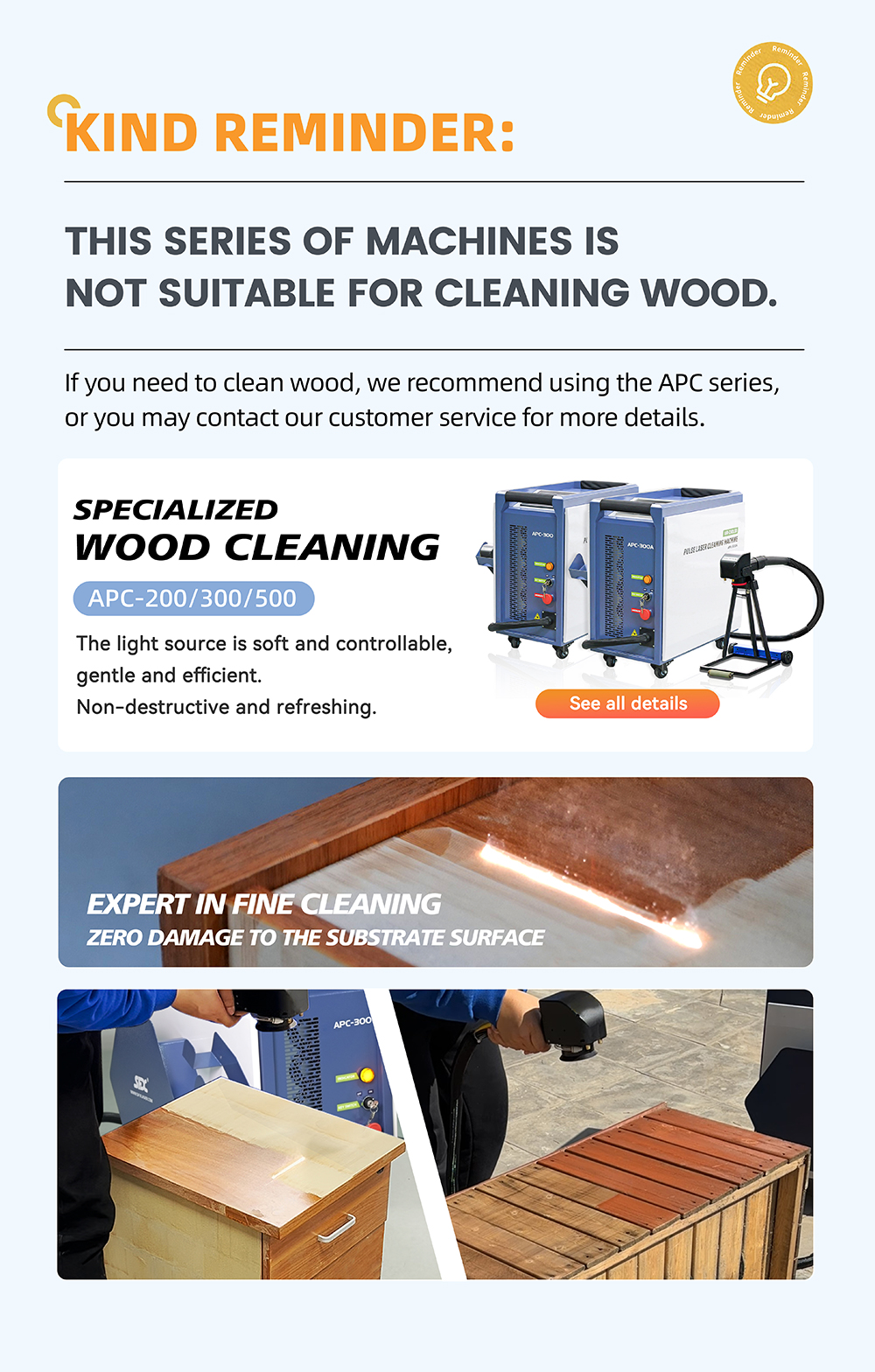 For wood cleaning, please try SFX APC-300 Laser Cleaning Machines. This model can not be used for wood cleaning.
