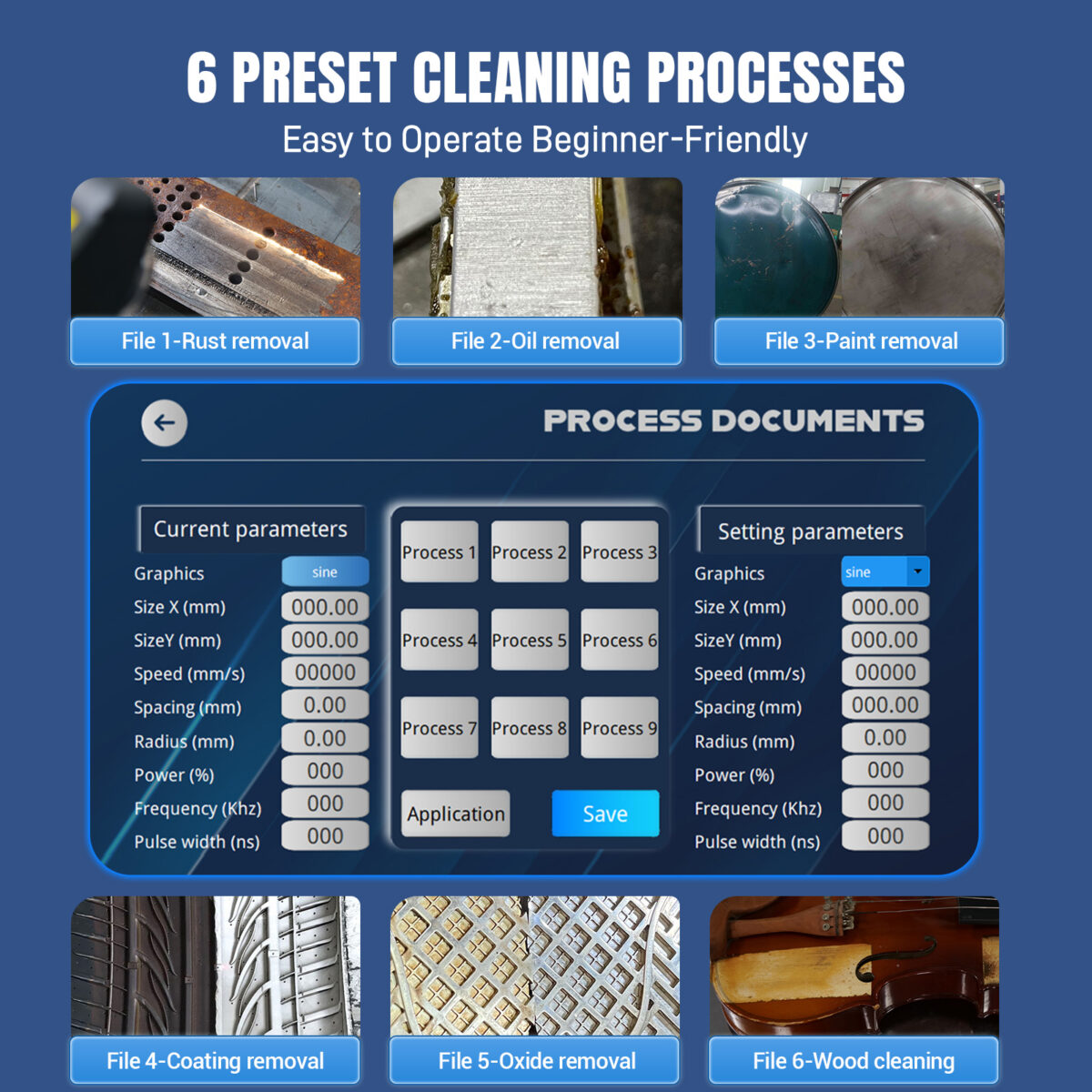 - Easy operation, 6 preset cleaning processes for rust oil paint coating oxide wood cleaning + 3 custom ones, corresponding to different usage requirements.