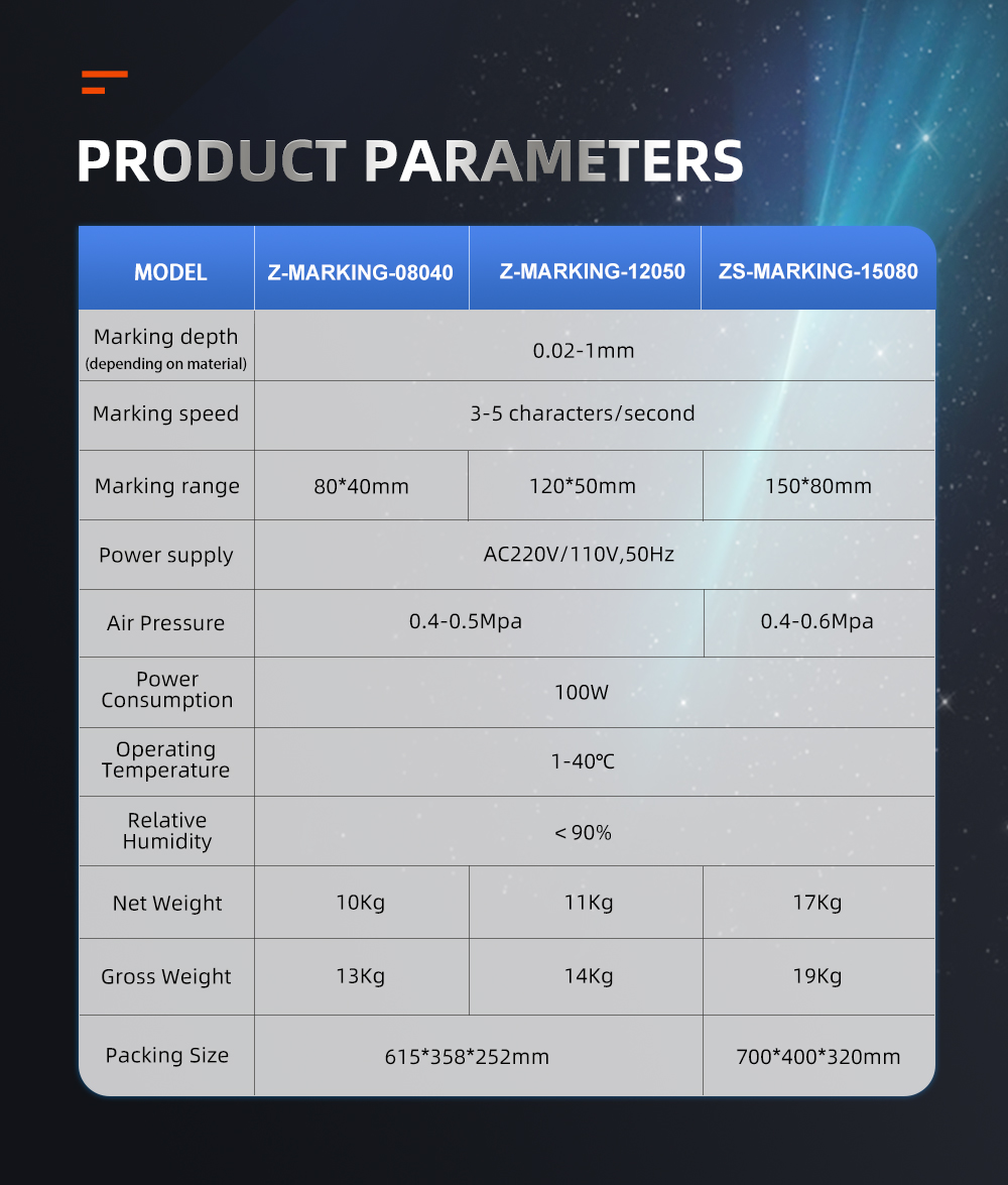 - Z-MARKING-08040/12050 dot peen marking machine features a hard alloy marking needle suitable for materials with a hardness less than HRC60.